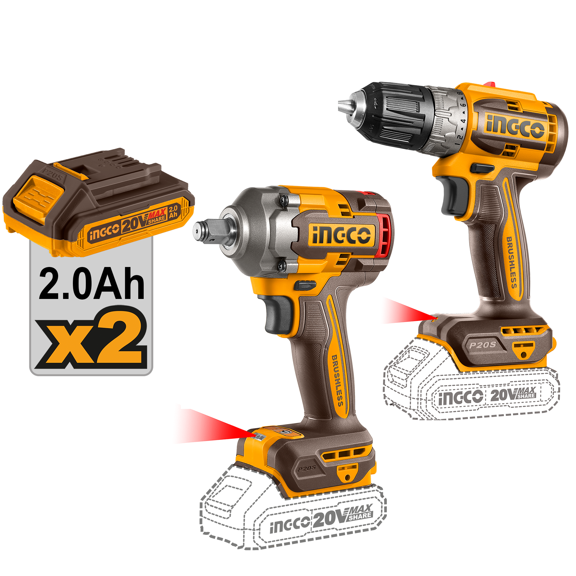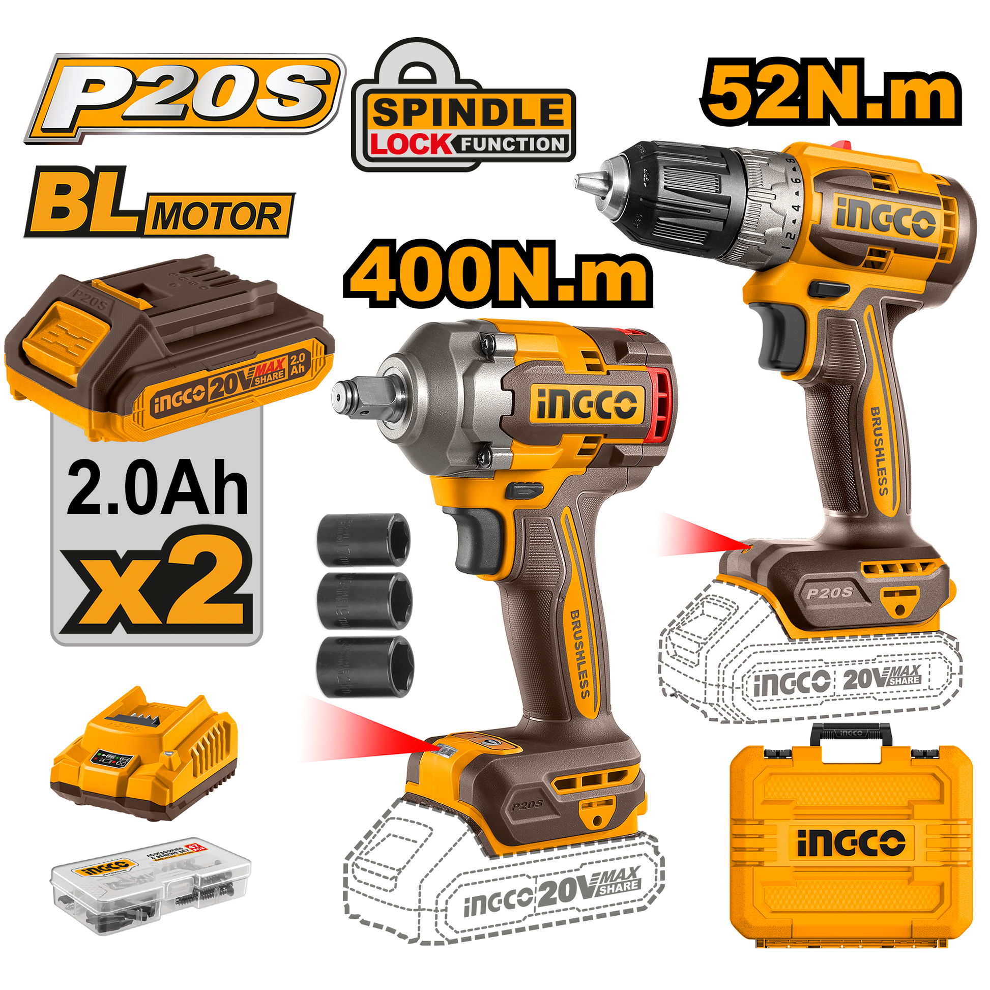 COMBO 1 TALADRO 20V 52NM (CLI204531) 1 LLAVE IMPACTO 20V 400NM (UCIWLI2040) CON 2 BATERIAS Y CARGADOR INGCO UCKLI20271